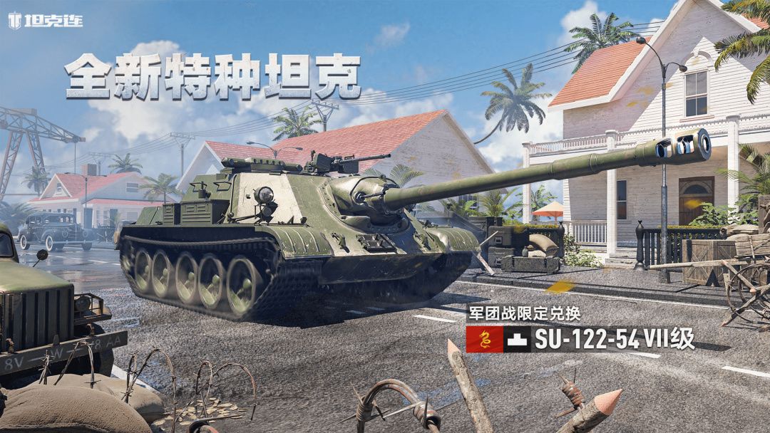参加军团战不仅能收获丰厚奖励,获得的大量军功还能在军功商店中限定兑换全新的VII级特种坦克SU-122-54。