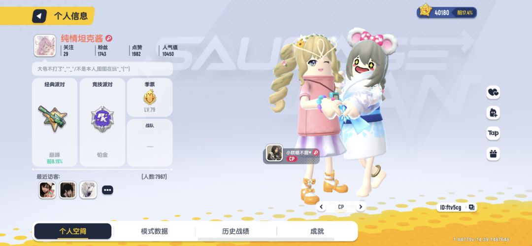过去一段时间,和我玩的好的朋友都知道你,因为你每天观战我,访问我的主页,还要顺着访客记录和战绩一起拜访,他们都被你每天访问主页搞得很烦,但感觉你年龄偏小,所以我并没有当回事,没想到今天把游戏下载回来时看到了一个惊喜。