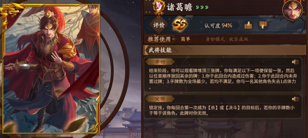 要说诸葛瞻的强度也确实值得一个史诗位,一技能罪论最多3牌大闭月,还可以反手打极限1换1,二技能父荫更是人称大空城,稳定抗一刀,虽然一二技能相性上有冲突,但本身是兼顾防御和过牌的,蜀国为数不多的回合外能防御的将。