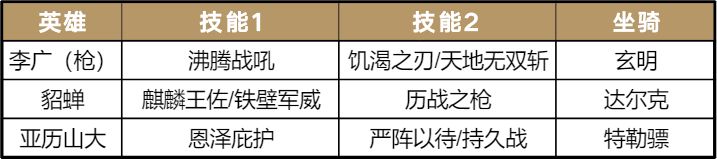 该阵容输出能力和李广骑相当,甚至略高;论免伤有亚历山大配恩泽、历战之枪、貂蝉加守备,可以说谁都不虚;回复方面如果李广带饥渴,全阵容就有了5个回复技能!集结战斗轻松奶上大几万!打野开地自然也不在话下~