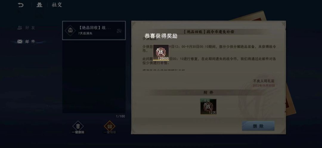 这次更新后有玩家回收金装出现bug,没有给战令币,不管你回收一件还是两件,都补偿了12W战令币!什么概念!我们要回收10件才有12w,你们就这么搞我们玩家,别人一下多了那么多资源,你让我们怎么玩!!!不出来解释一下,跟你们没玩!