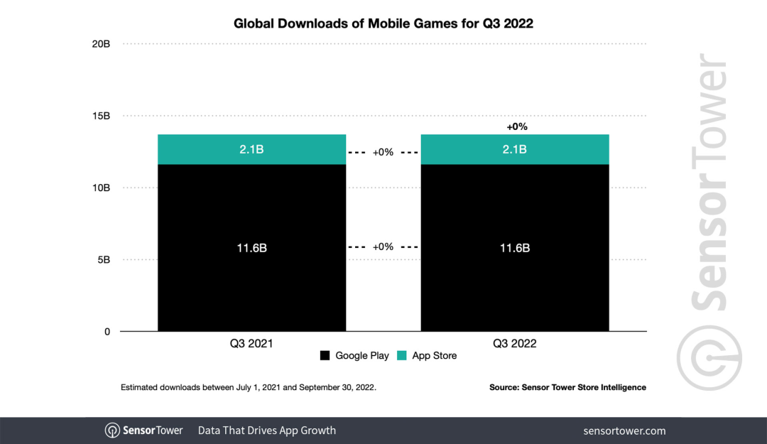 整个第三季度,两大移动应用商店的手游总下载量达到了137亿次,与去年同期基本持平——App Store和Google Play的当季度手游下载量分别为大约21亿和116亿次。