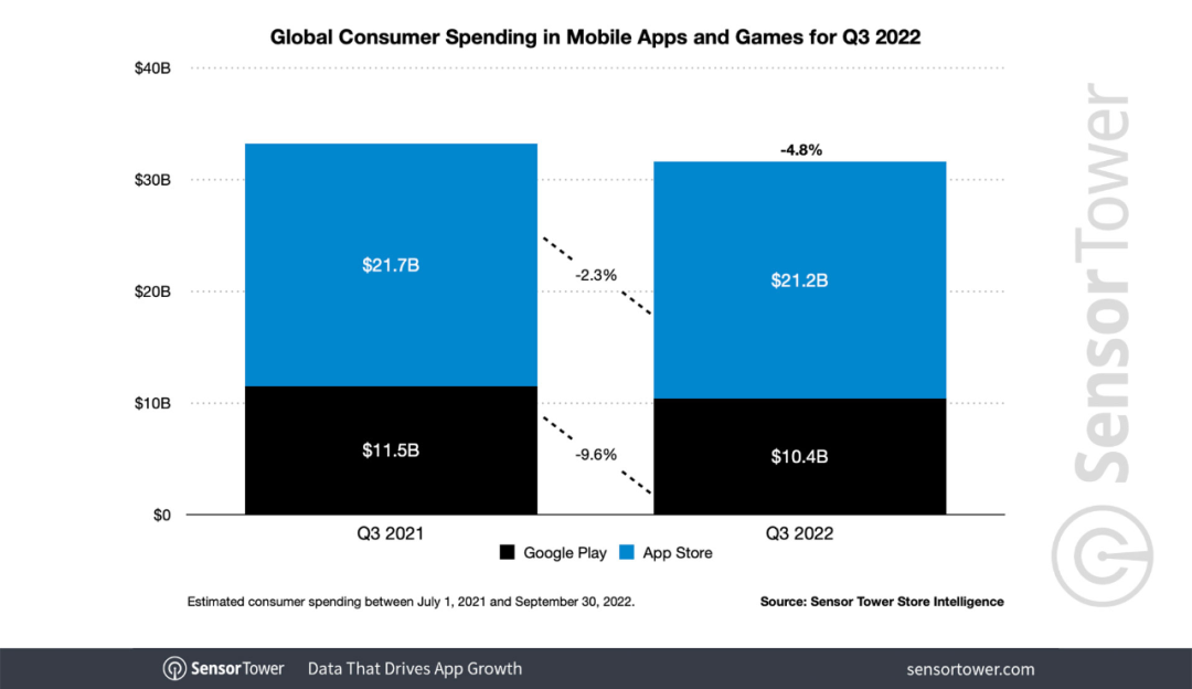 Sensor Tower在官网博客的一篇文章中写道,Q3苹果App Store、Google Play的营收达到了212亿和104亿美元,与去年同期相比分别下滑了大约2.3%和10.4%。