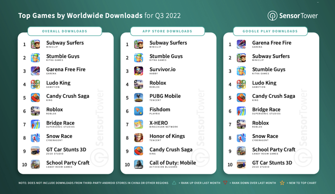 Sensor Tower还提到,《地铁跑酷》是Q3全球App Store和Google Play下载量最高的手游,达到了大约8620万次。《Stumble Guys》和《Garena Free Fire》排名手游下载榜第二和第三,当季度下载量分别为7700万和6230万次。不过,《Free Fire》在Google Play商店领跑Q3手游下载榜,下载量达到了5670万次。