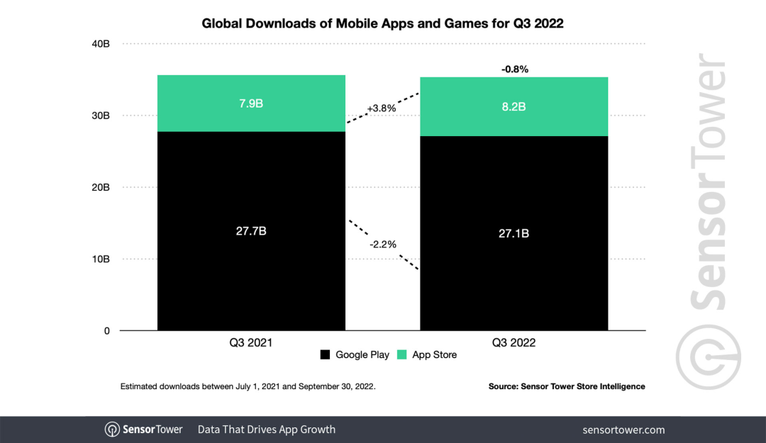 根据Sensor Tower的统计,2022年第三季度,App Store和Google Play商店在全球范围内的移动应用下载量达到了353亿次,同比略有下滑(1%)。其中,App Store当季度移动应用下载量约为82亿次,较去年同期上升3.8%,但Google Play移动应用下载量(270亿次)却同比下降了2.2%。
