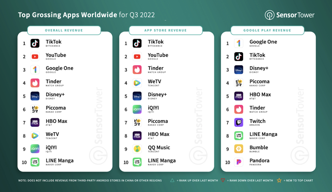 在第三季度,短视频平台TikTok(及中文版抖音)仍然是全球App Store和Google Play最吸金的非游戏类应用,当季度营收约为9.144亿美元,迄今为止累计收入已经高达63亿美元。文章提到,TikTok是苹果App Store营收最高的非游戏类应用,不过在Google Play的收入Google One,后者Q3在谷歌应用商店的收入超过了3.3亿美元。