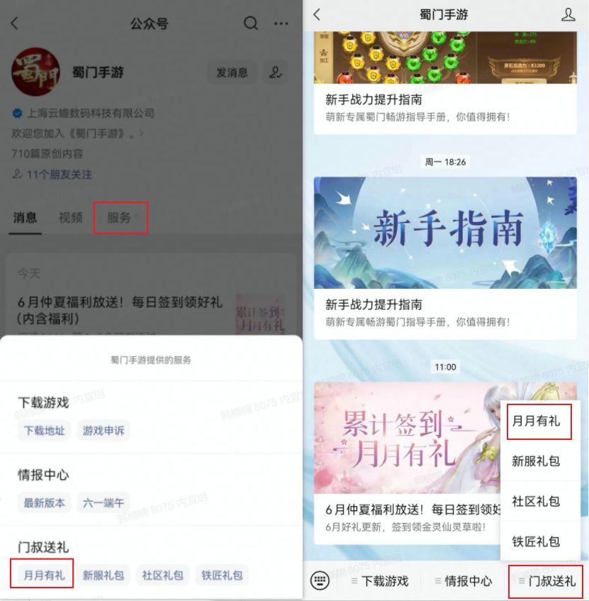 进入《蜀门》手游公众号,点击【服务】,选择【月月有礼】或点击公众号后台菜单,选择【门叔送礼】-【月月有礼】进入领奖页面。
