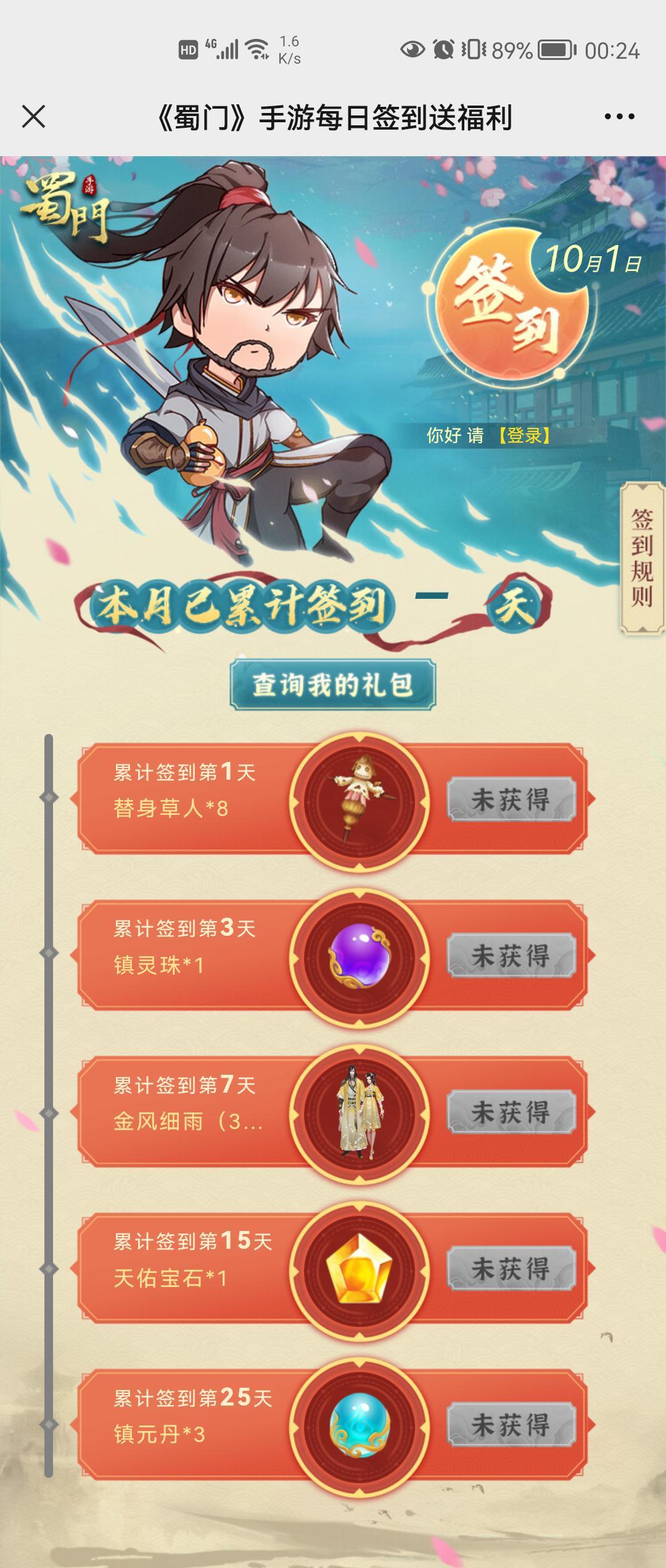蜀门手游微信公众号每月签到礼包更新!10月更新多重好礼!只需要在公众号内每日签到,即可轻松领取镇灵珠及镇元丹!