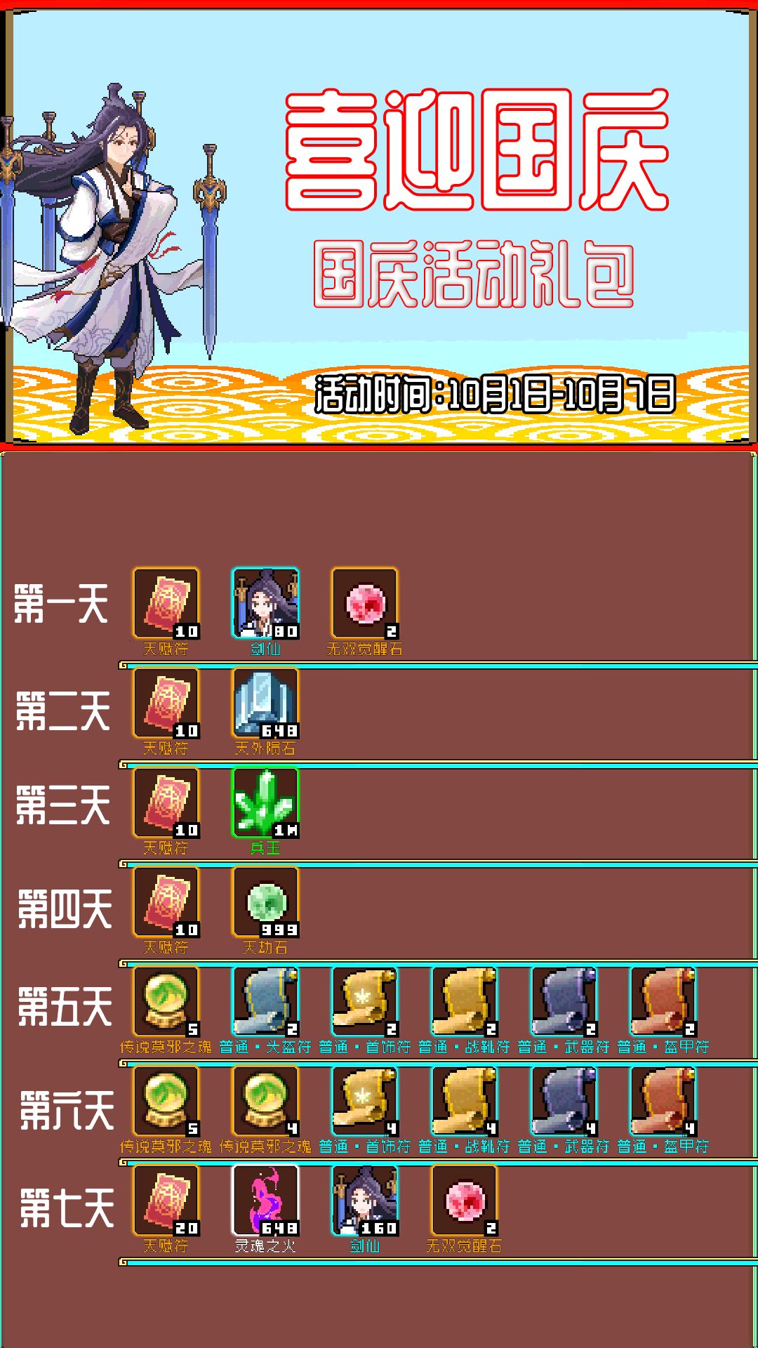 轻松愉快的国庆假期就要来啦,为了满足各位勇士爆肝游戏的心愿,我们特此准备了7天连续大礼包,每日登录游戏即可领取当日福利!