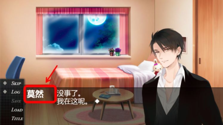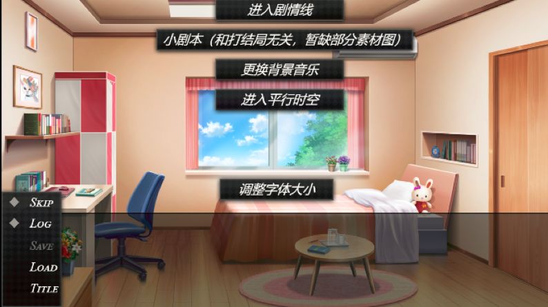 左下角的菜单会有skip(快进), log(记录),load(读取),save(存档),title(回到标题界面)五个选项。