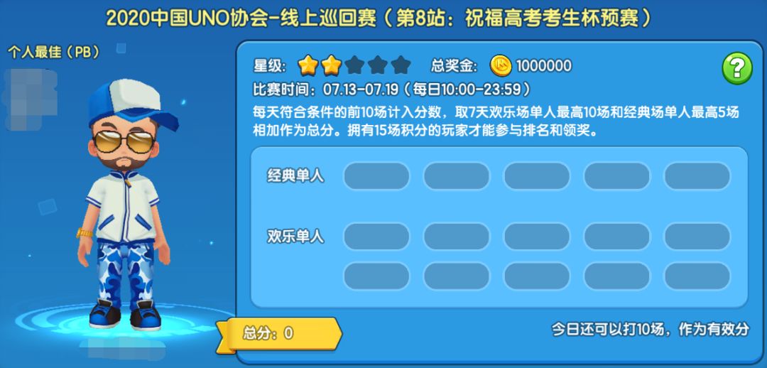 2020UNO中国线上巡回赛“福州站”周预赛仍在进行中,每天进行经典场或欢乐场的单人游戏,就可以参加到我们的赛事里来!每次战报都需要提醒还没有参赛的玩家朋友们:只要参加周预赛就可以拿到参赛奖金!如果能够晋级周赛并拿到全国前100或全省前十的名次,除了获得丰厚的奖金外,还可以直通月赛哦~ ————————————————————————————————关于2020UNO中国线上巡回赛 风靡全球,拥有一亿以上玩家的UNO牌(中文:一起优诺)正式开启了在中国线上 “欢乐竞技”系列赛事! 本次UNO中国线上巡回赛,全年共设69站,以全国各地的著名城市命名,巡回在全国举办。 巡回赛将每月都将产生一位UNO中国大师头衔获得者。未来这些大师将有机会与全球204个国家和地区的大师玩家过招,争取全球桂冠。 中国赛事主办方为夺冠玩家准备了冠军奖牌、精美的证书、以及正版UNO纸牌。 在UNO官方正版手机游戏《一起优诺》中,2020UNO中国线上巡回赛还将颁发超过6亿游戏金币,供获得名次的选手瓜分。 UNO牌向来以3分钟即可学会而闻名于世,本届UNO中国巡回赛致力于为UNO牌爱好者创造一个“欢乐竞技”的独特电竞门类,让更多的爱好者参与其中。