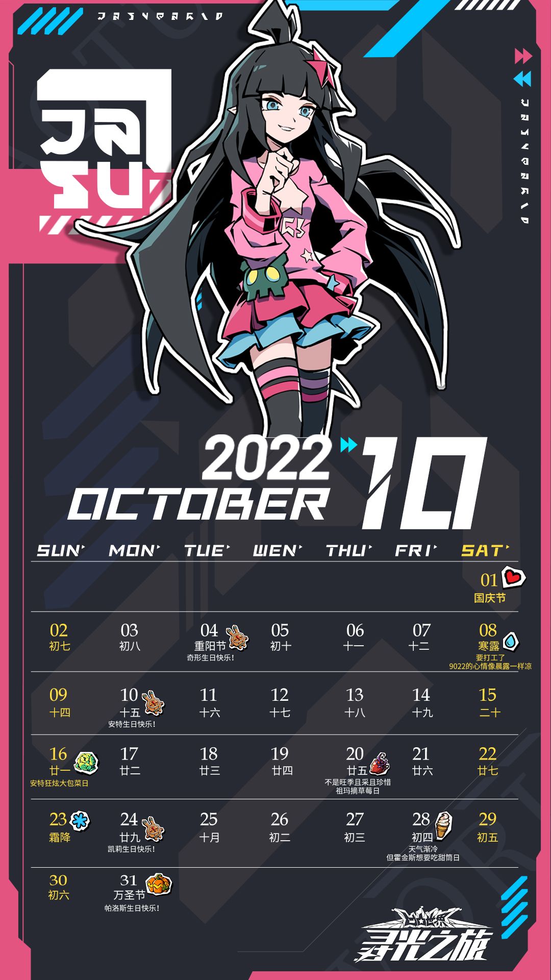 9022捎来主办方最新设计的十月月历!小长假开始,各位在假期都有哪些计划呢?有在体验先锋服嘛(期待脸