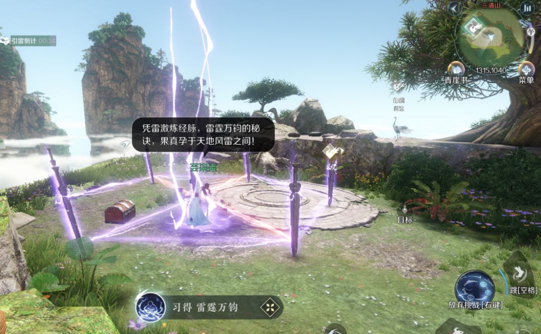 如果一直没被雷劈,你甚至可以主动求电。首先需要来到三清山(1234,931),通过棋子移动到神秘空岛,再触碰(1315,1047)的雷电宝箱,就可以习得该技能了。