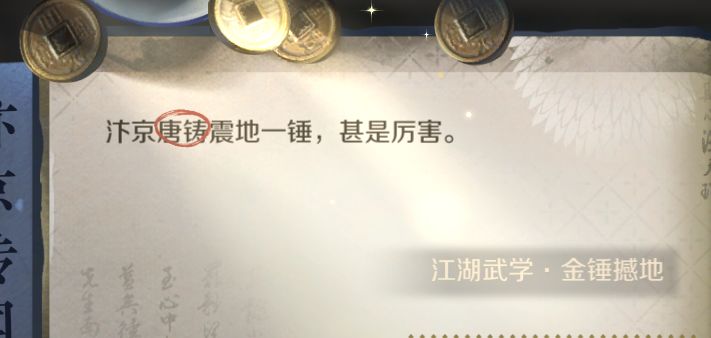 接着来到汴京(947,1093)和唐铸对话唠嗑,夸他是忠肝义胆之人。或许大哥一开心便教咱们一手入门锤艺呢!江湖技能【金锤震地】轻松到手!