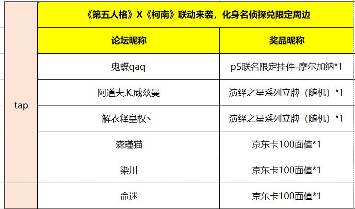 大家好,感谢大家积极的参与本次“《第五人格》X《名侦探柯南》联动来袭,化身名侦探兑限定周边”活动,现将活动中奖名单公布如下↓,没中奖的友友请不要气馁,多关注论坛最新活动公告,祝大家游戏愉快。
