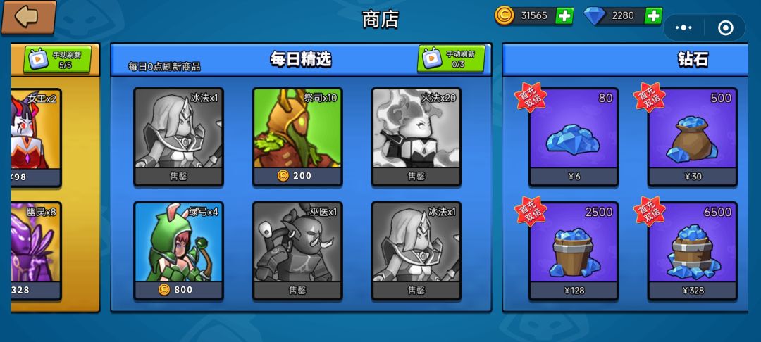 2;商店刷新,每日3次,有几率出(大概3天能出一个,(1000钻买,重复的没必要买,就买自己没有的,毕竟不氪金)