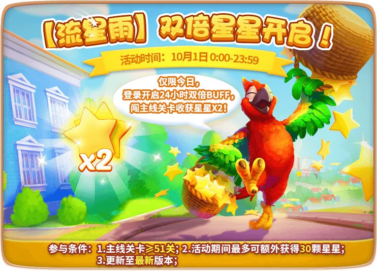 活动当天登陆游戏,通关即可收获双倍星星!