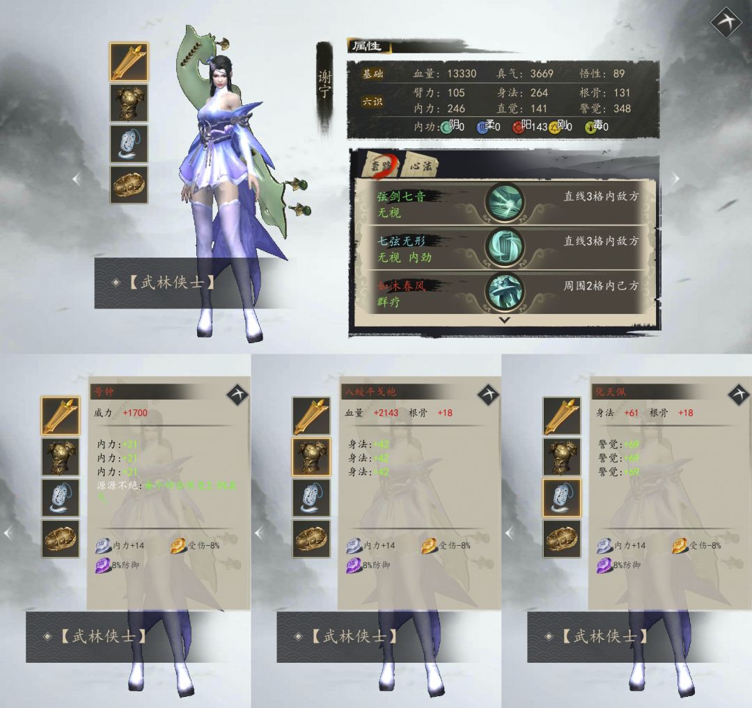 队友毕业装备、属性如图,属性只来源于修为和装备(钟离雪身法溢出14,谷之雨内力溢出5)