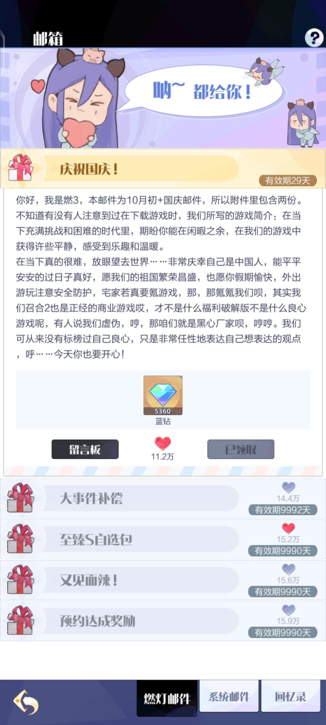 就像燃3说的他自己玩游戏透支几个w,不要像他一样。但是生活中这不正是一部分人的真实写照嘛(虽然没有几个w那么多)。闲钱氪金,生活费氪金,工资氪金,透支氪金。。。严重的偷父母的钱氪金上新闻。谁不是因为一时的热爱冲昏了头脑上头了呢,但是这么热爱反而让游戏慢慢变了味,然后面临的就是血本无归的弃坑。我能理解好的游戏商需要资金去维护和启动新的游戏,就像当年的刺激战场(虽然现在越来越骗氪但是不怎么影响平衡)还是比较中肯的。所以我愿意拿出这买包子的钱支持一下(小小叛逆),但也会听从燃3的劝说不会大氪,毕竟年卡的是可以通过时间免费获得的,这笔钱还不如陪父母或朋友或喜欢的人去搓一顿或者做的有意义的事情。虽然刚步入社会,但我也不想像工作一样去打卡游戏强迫登录,游戏本来就是放松的。燃3也说了几天不登录也没问题,因为他相信我们会重聚召合世界,去感受快乐~