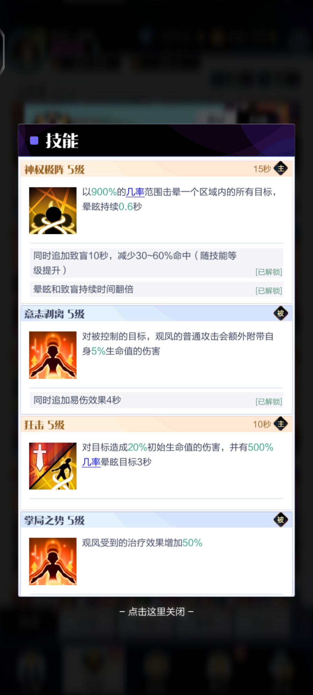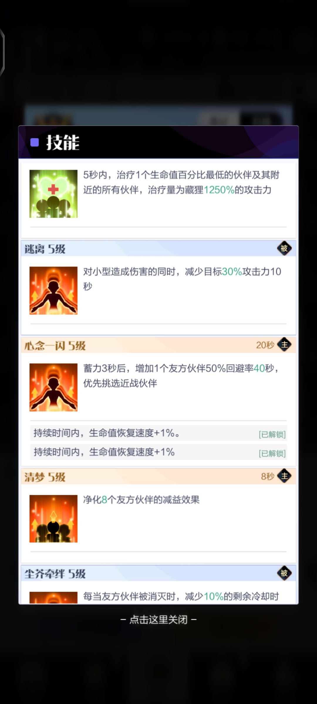 挡在奥克前面不需要有奥克硬,帮助奥克吸取伤害然后献祭自己让奥克成长。简直就是慈母手中线,游子身上衣。感动哭了T﹏T。咱们看看她的技能。百分之900的概率击晕目标,还有概率附加致盲效果,什么概念你击晕不了燃3都为你流泪,你那手气没的说(偷笑)。再加上易伤和沉默(你说为什么图里没看到沉默?低情商:因为截图就这么长咯,不要为难手机。高情商:为了让你感受到快乐自己上游戏点开技能介绍往下看看👀)控制拉满,妈妈再也不用担心后排立马嗝屁。自身还能增加50%的吸收奶量,奥母的简直就是光。