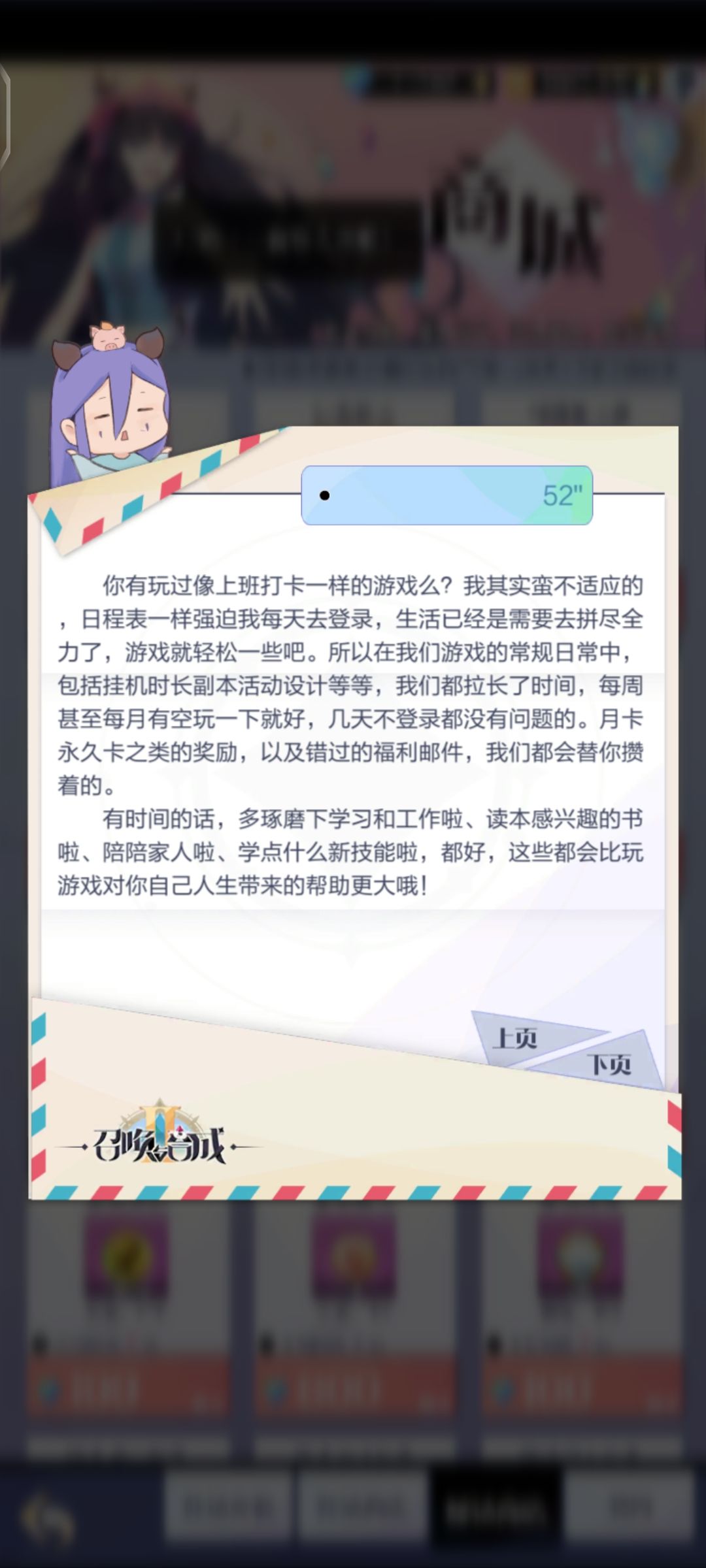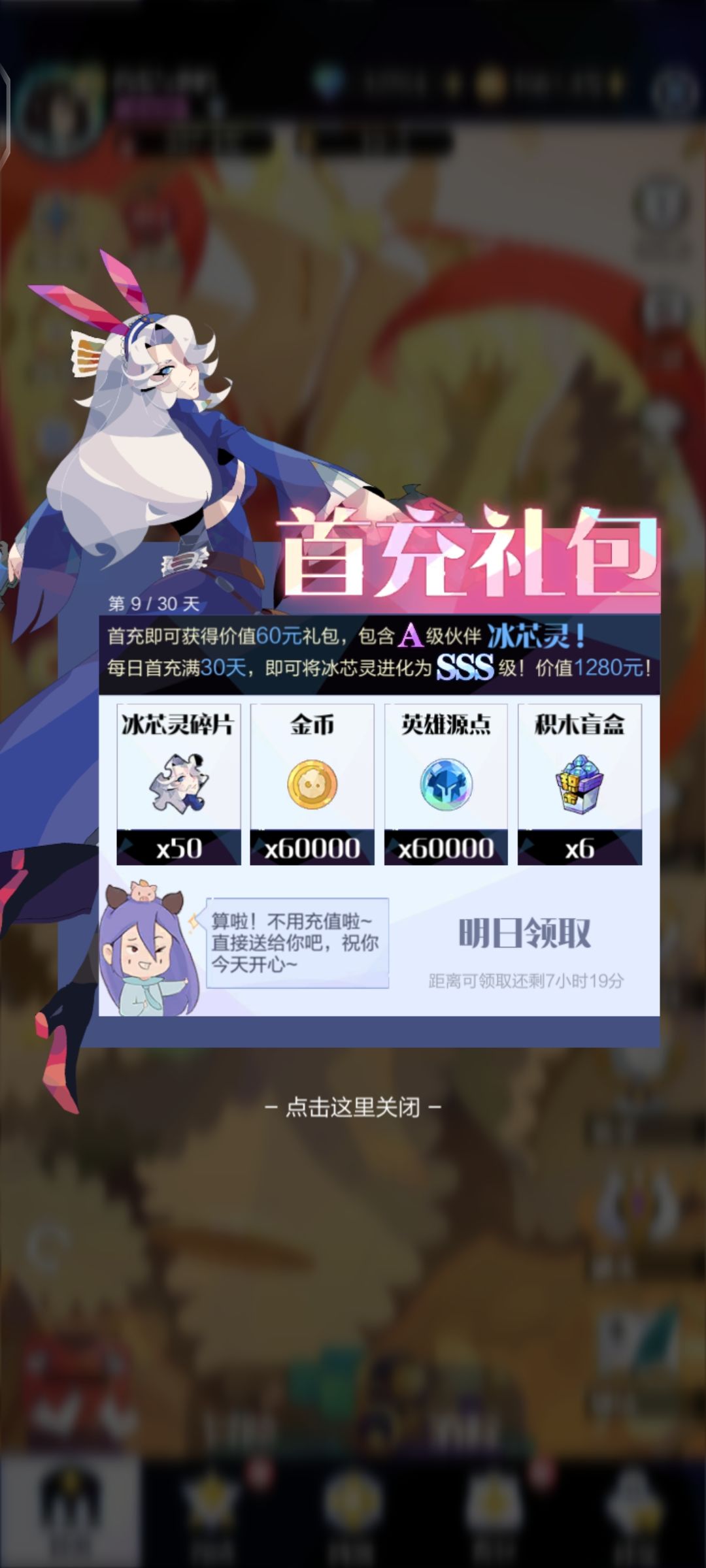 本来想做个月卡党的,结果来这么一手没想到啊登录够天数直接送,我没注意直接充了30,好咯我等着继续白嫖,附近满满啊家人们良心企业。喜欢这游戏的另一方面是因为它是竖屏哈哈哈好摸鱼,摸鱼的快感永远是最实在的嘿嘿。DDDD(自己翻译)