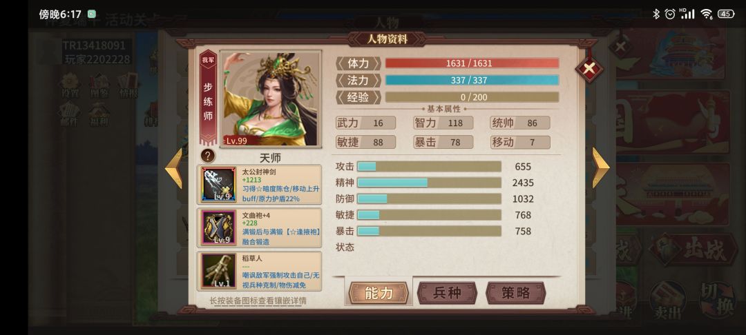 配置:霸刀猛兽兵典韦、无伤嘲讽肉、骑策若干、妖术师(用好假情报混乱敌军)、天师(九宫格回复状态,带双飞翼也可以)