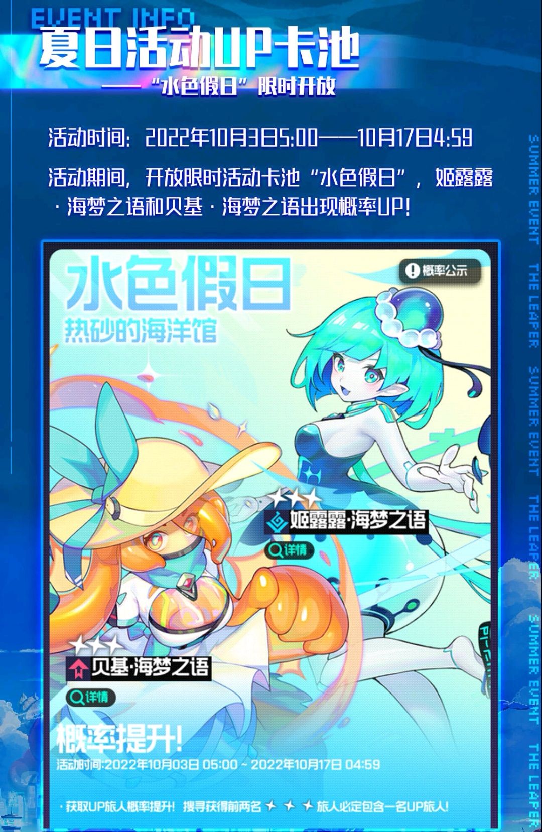 10月3号上午即开启一期夏活,同时开启两位海滩角色的抽取。