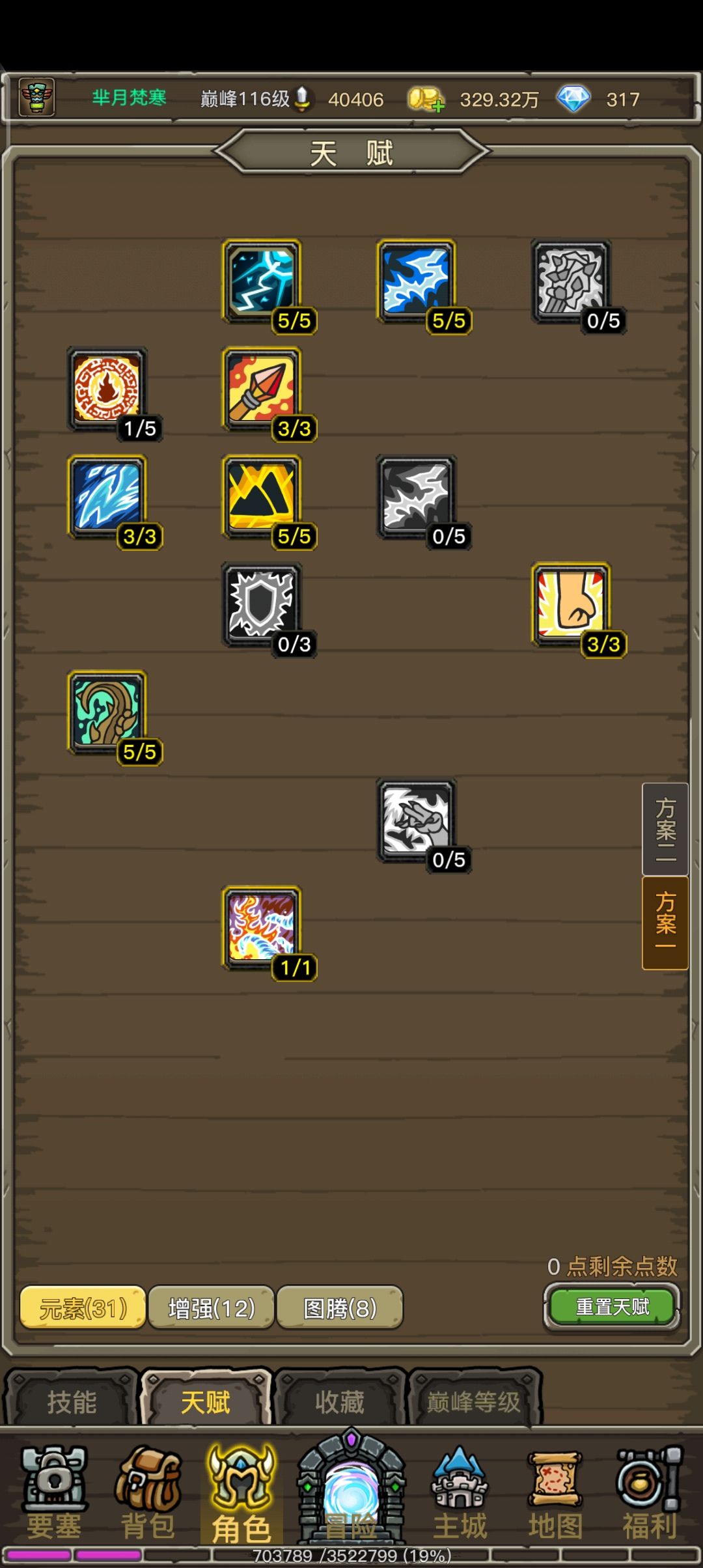 增强深处的天赋其实很无力,乱舞之后就很没吸引力了,但是元素天赋的终极天赋就很香了,50%的爆伤加成,嗯,对物理还有元素伤害也有效,所以有了这套天赋,但是注意,得到至少50级才有用,因为得到50才能点到增强那边加武器暴击的天赋。