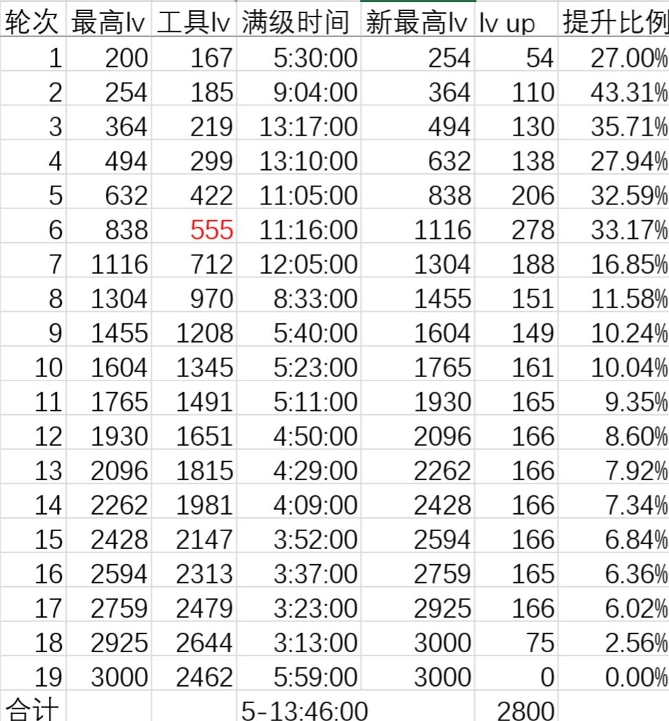 注:红色数据由于操作失误,升级的4个工具等级不一致,根据4个工具等级推测的原本应该的等级(误差应该不超过±2级)