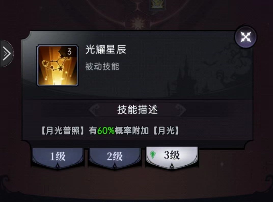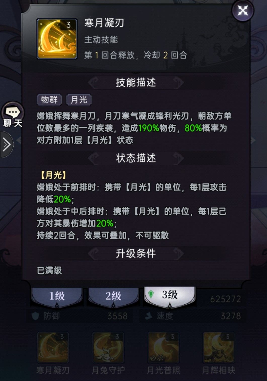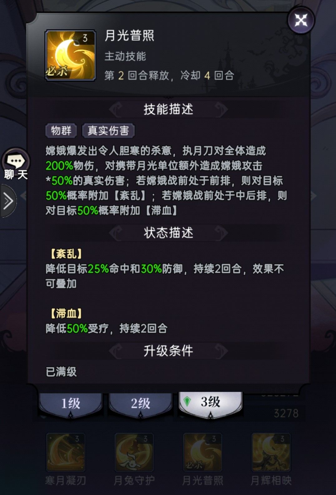 如图所示,3技能,当嫦娥位于前排时候,有几率施加紊乱状态,给对面降防降命中。此外,当嫦娥觉醒时,3技能有60%概率施加月光状态。