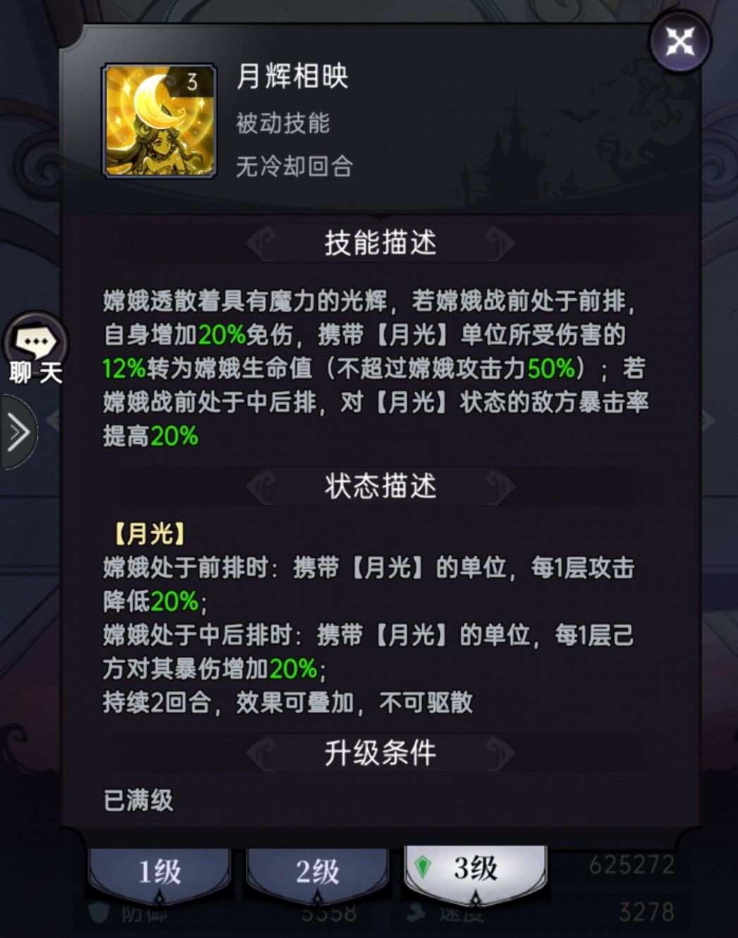 如图所示,一技能,当嫦娥位于前排时,通过给对方附加月光状态,是可以减少对面20%攻击的,且不可驱散。