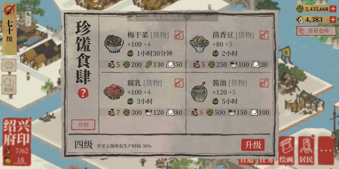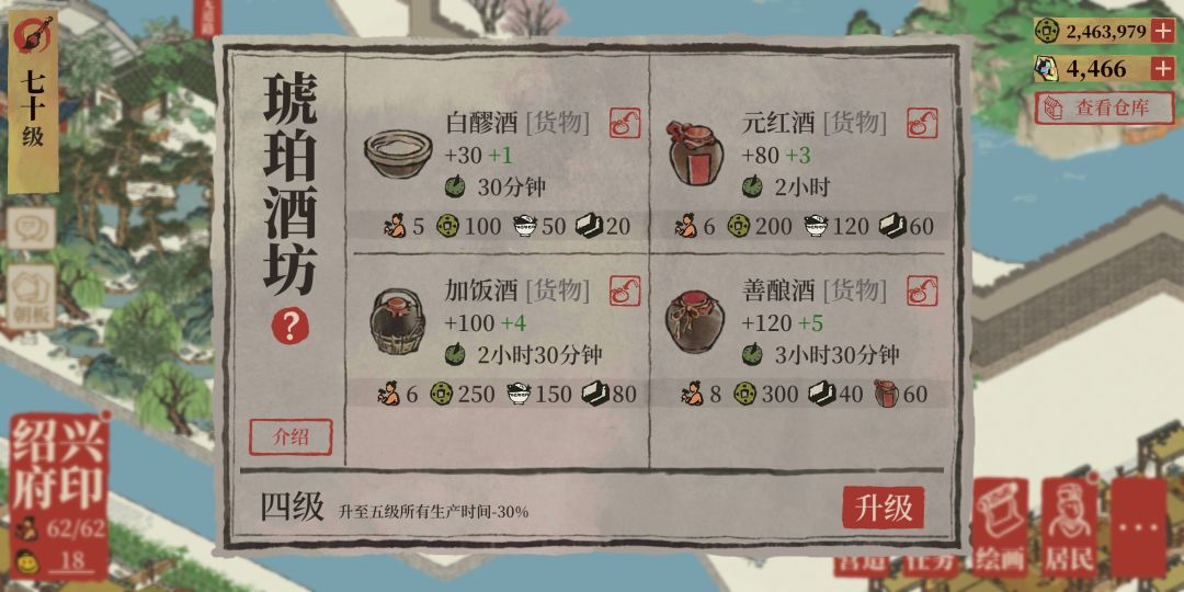 生产:酒曲、4级货物需要2级货物为原料