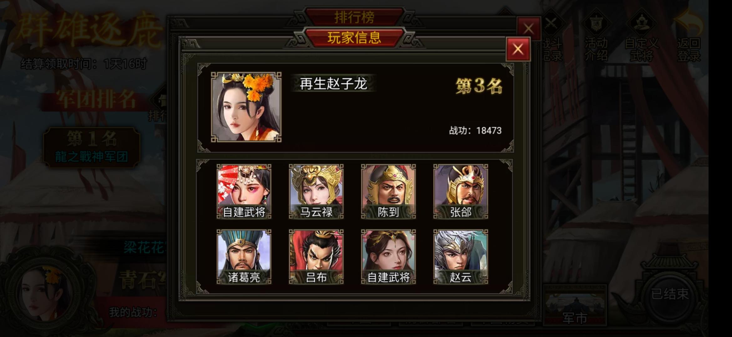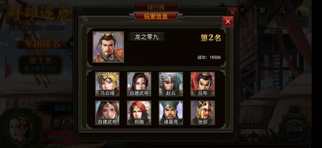 第二名是我们的智囊团龙之零九军团。龙之零九军团的配备的武将是马云禄、赵云、吕布、祝融、诸葛亮、张郃、太史慈和3位自建武将。