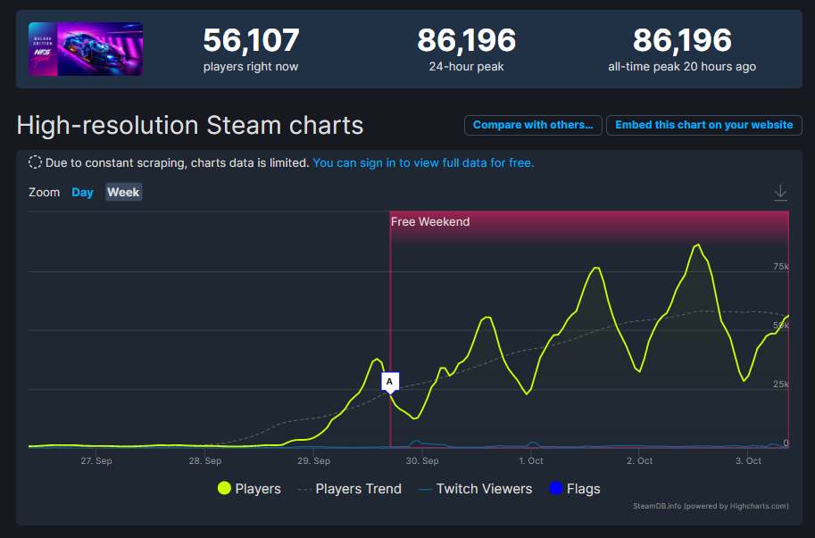 SteamDB数据显示,近期《极品飞车:热度》的同时在线人数飙升,峰值达到了86196人。