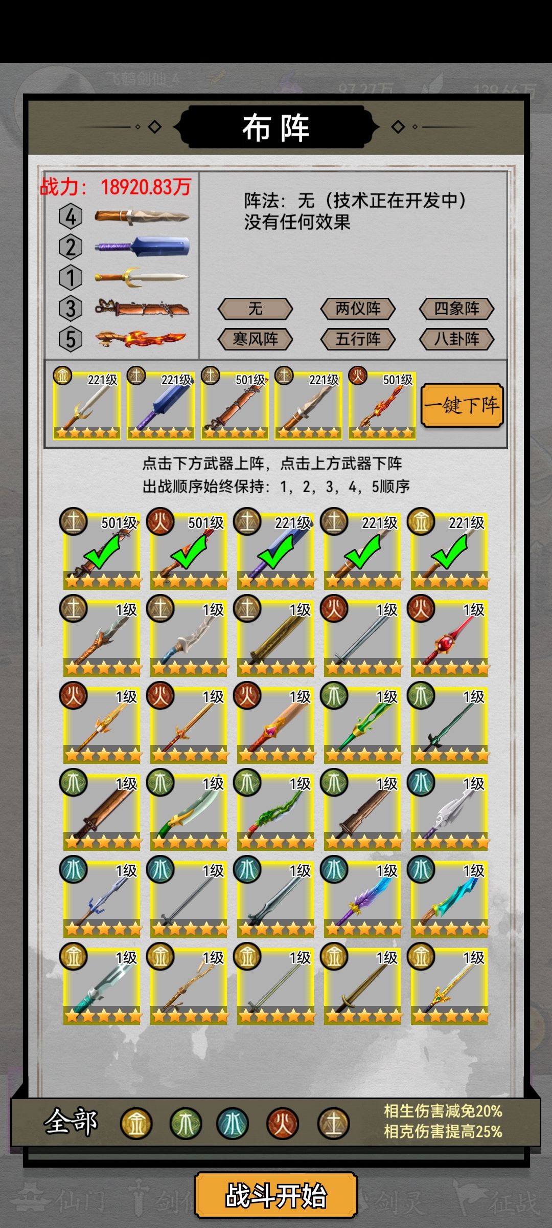 剑灵搭配部分相对来说比较简单,各位大佬也都达成了共识,游戏到这个阶段,关卡产出的灵石灵气已经较为充裕。而图示的五把剑也是能适应大多数关卡的黄金组合。这五把剑分别是金锋,土憨,泥昊,戊土,烈焰。大多数的平推关卡都可以用这五把剑通过,不需要更换阵容。