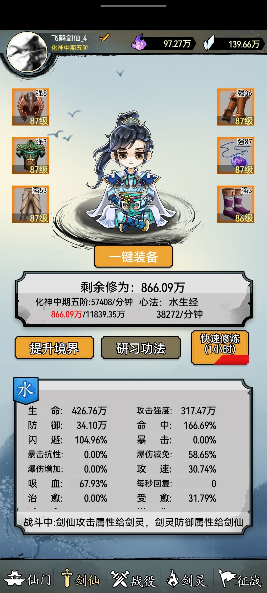 等级分配就参考图示,除了泥昊和烈焰,其他的剑保持221就行了,泥昊和烈焰平均升级,升到501足够了,多出来的灵石后面装备篇提供用途。