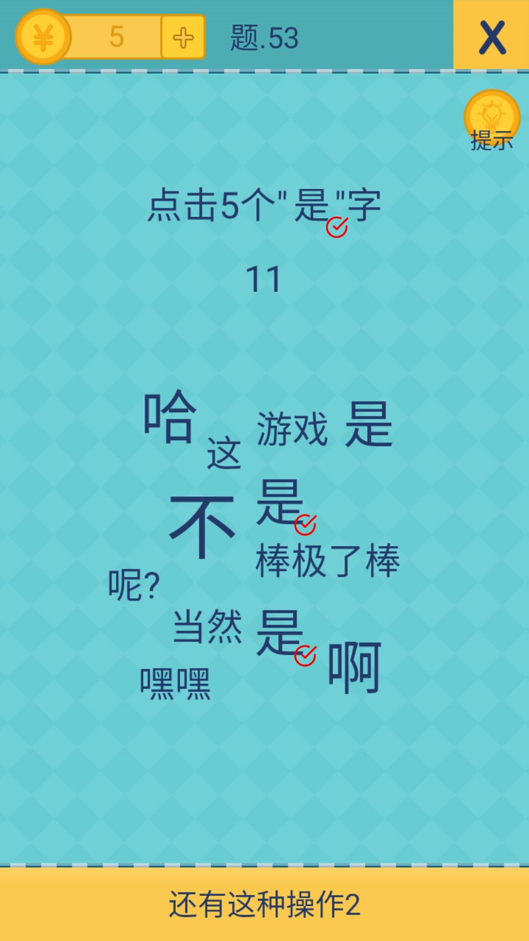 53关,找五个是,明明有五个“是”了啊。我是提示君他不是有个是字吗?