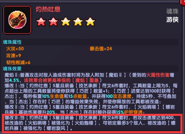 首先螺岩和箭塔的攻速是和你的攻速挂钩的攻速高,螺岩和箭塔伤害才高,其次7星魂珠的效果必须要400攻速才能触发,而魂珠1星的效果可以提供100攻速,所以我们面板需要有300攻速即可