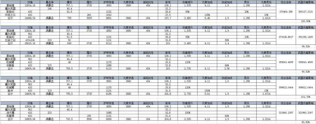 上表中的工厂套带入的都是1500能量的情况,可以比较清晰的看出来只有斩裂剑+终炎是比较好的选择,虽然1500能量的脉冲+机械臂以及斩裂剑+应答综合倍率差不多,但是在终炎毕竟可以额外提供666护甲削减,是非常的实用,而且这个数据是带入了首领,而终炎首领比较低算是比较吃亏的,而正常来说螺岩只拿来对群,所以目前只推荐带斩裂剑+终炎