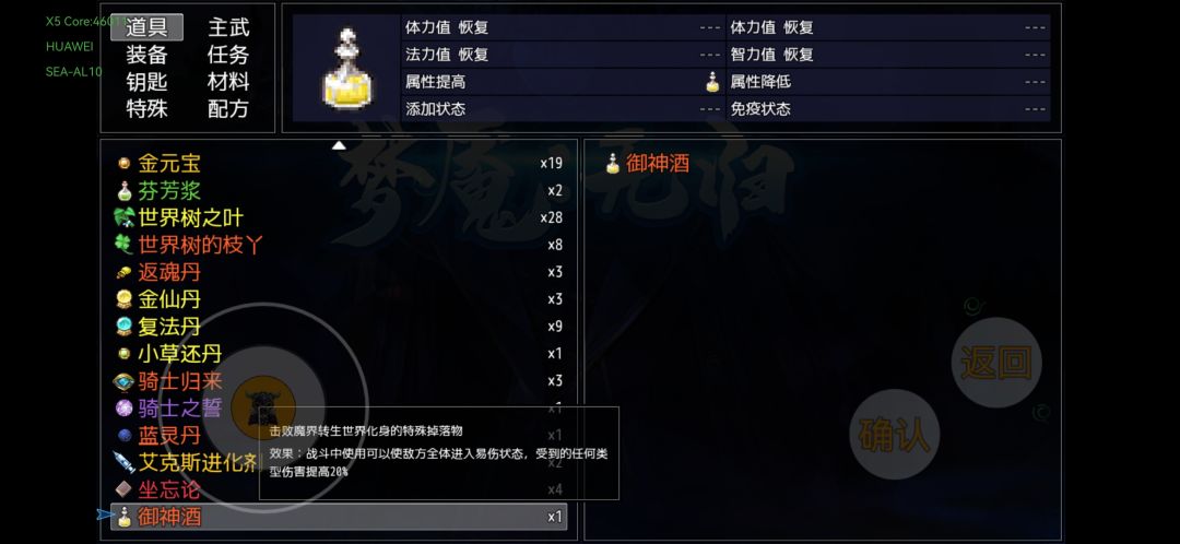 魔主世界世界之核三神酒,附图,第二种酒的持续时间是4-5回合,不是无限。三神器分别是力量+100,精神+100,敏捷+100。