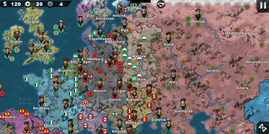尝试一次苏联,因为苏联在地图里的位置实在是太好了,最西边面对德国、意大利、西班牙这几个主要国家,最东边面对日本,基本上都是一个大陆的,甚至都没什么渡海的要求。所以思路上,就是先疯狂进攻欧洲,肃清最主要的敌人,然后有了资源优势,再去扫荡日本。