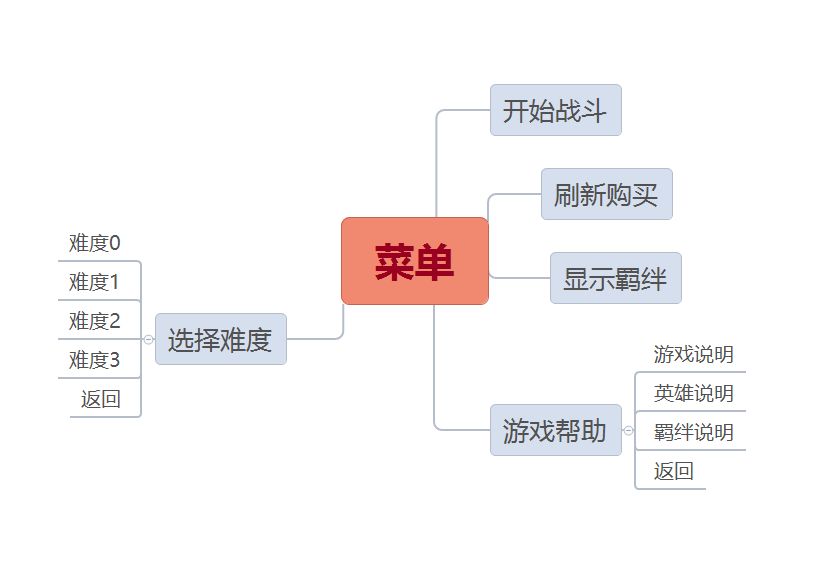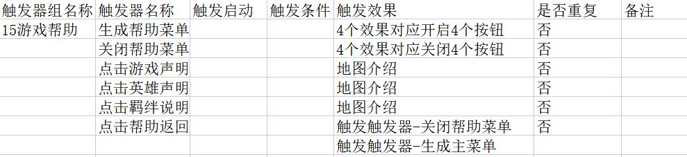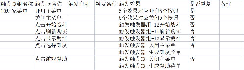 在实际游玩过程中,需要实现的是,点击功能的时候直接实现对应功能,但是点击像是“游戏帮助”“选择难度”这样的子菜单的时候,则要清除原有的上一级菜单显示内容,并更新下一级菜单内容。我个人建议将同一级菜单放进同一个触发器组里以此张图为例,差不多是这样: