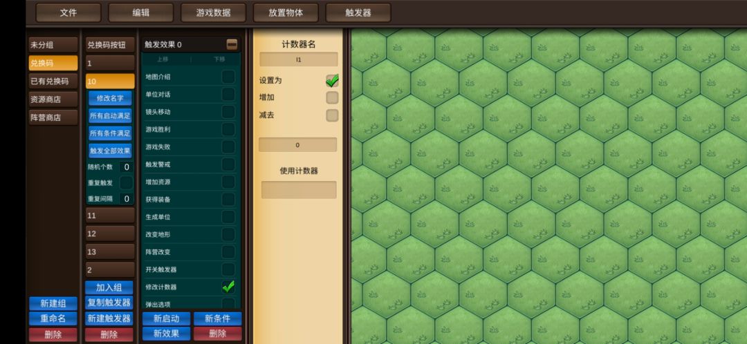 为了制作能够随时增减的按钮,在此我得介绍一个很多人都会忽视的一个功能:警戒。你可以设置警戒,可以不设置警戒。当警戒被触发的时候(可以通过触发效果中的触发警戒实现),以触发相应编号的警戒为触发启动的触发器会执行。所以,当需要一对多的(也可以一对一,不过那样的话触发触发器更方便)触发时,我们可以选用警戒来控制。