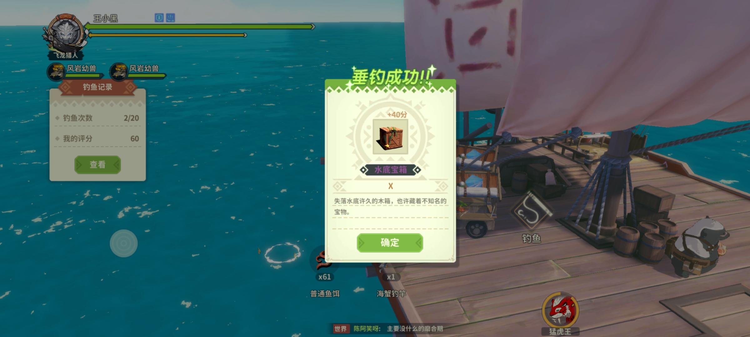 ,然后重新进去重新钓几率就大一些,反正我是这样子的不超过20个鱼饵就钓到宝箱了