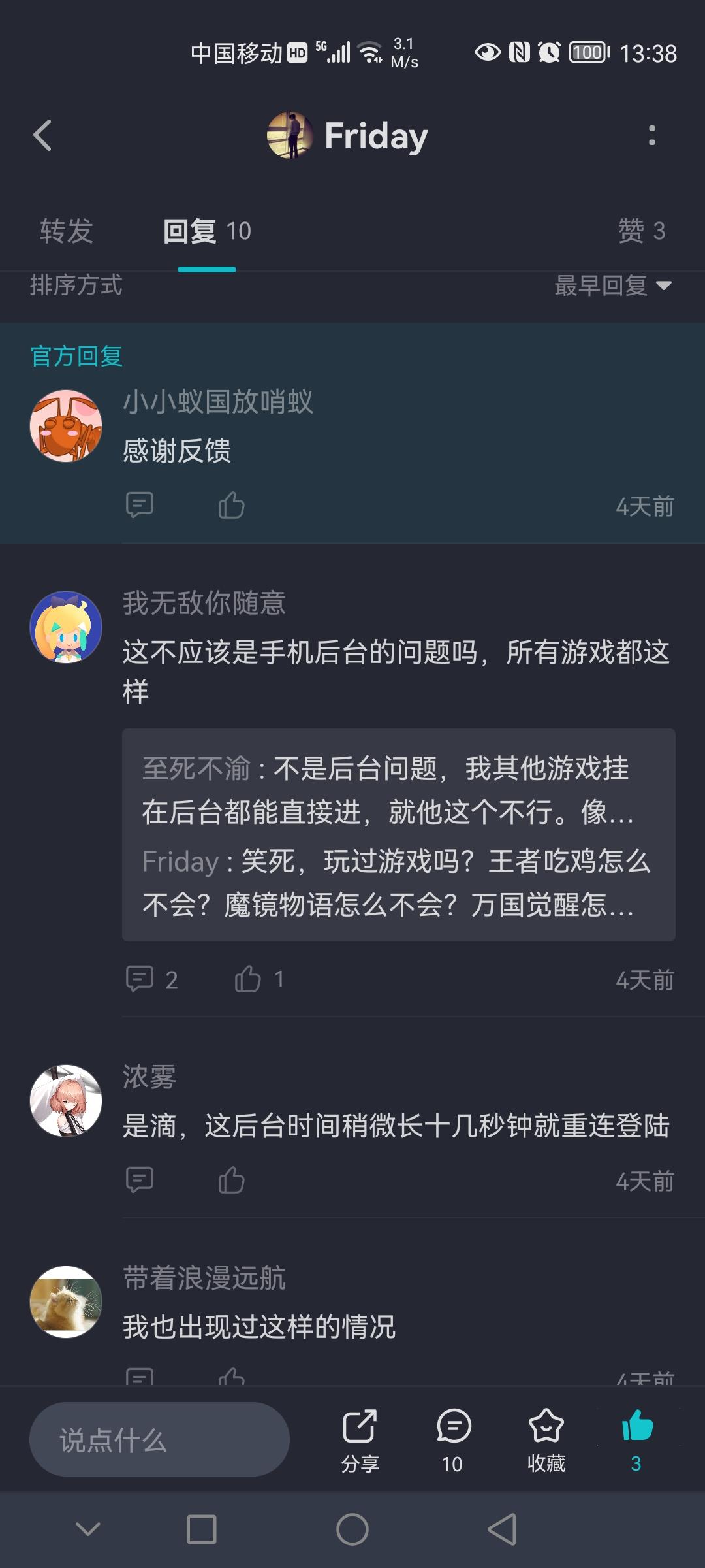 每次切出去回个微信不到20秒吧回来又得重新登录十几秒,难不成就是想让玩家看你每次登录的礼包吗??好烦呀,玩了10天了,充了也有几百,真的好烦啊!!都改革开放多少年了??可不可以像别的游戏一样直接在线连接??比如玩一个小时。连接也有一小时,抱歉,反正这样我扛不住了。