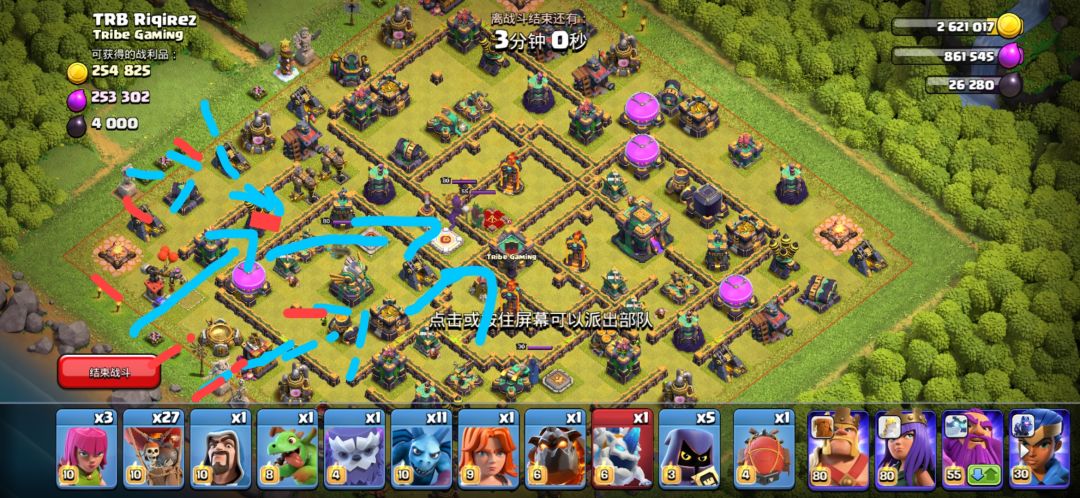 3点,雪怪加法师打改装加农炮(断边),兵营处可补弓箭清下边 5点圣水器位置,下三王,女王从缺口进,开技能,打本,法塔,改装箭塔,下气球处理,补润土打单头,因为女王吃毒了。男王永王处,打6点投石,男王半血开大,接金身,逼近鸟炮后下狗球。解决对手润土时记得补猎手。