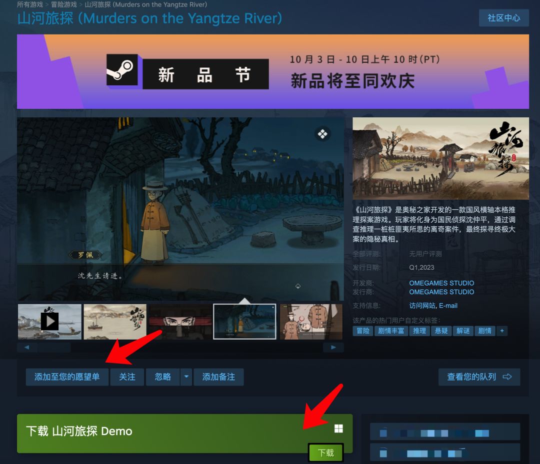 *本次demo仅在steam国区发行(非蒸汽中国),大家下载时暂时关闭外区加速器进行游戏名称搜索即可。游戏名「山河旅探」
