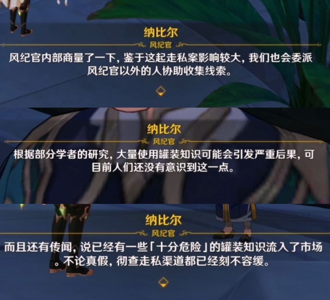 旅行者和派蒙听到纳比尔的担心后,得知市场上多了很多来历不明的罐装知识,纳比尔请求旅行者前去调查一番。