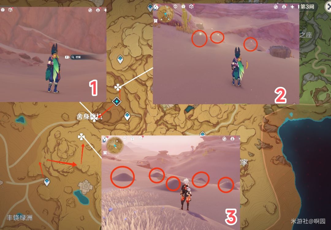 ★注:p1为挖掘宝箱;p2和p3为用风元素吹散沙堆,后会出现怪,然后击败后有普通宝箱