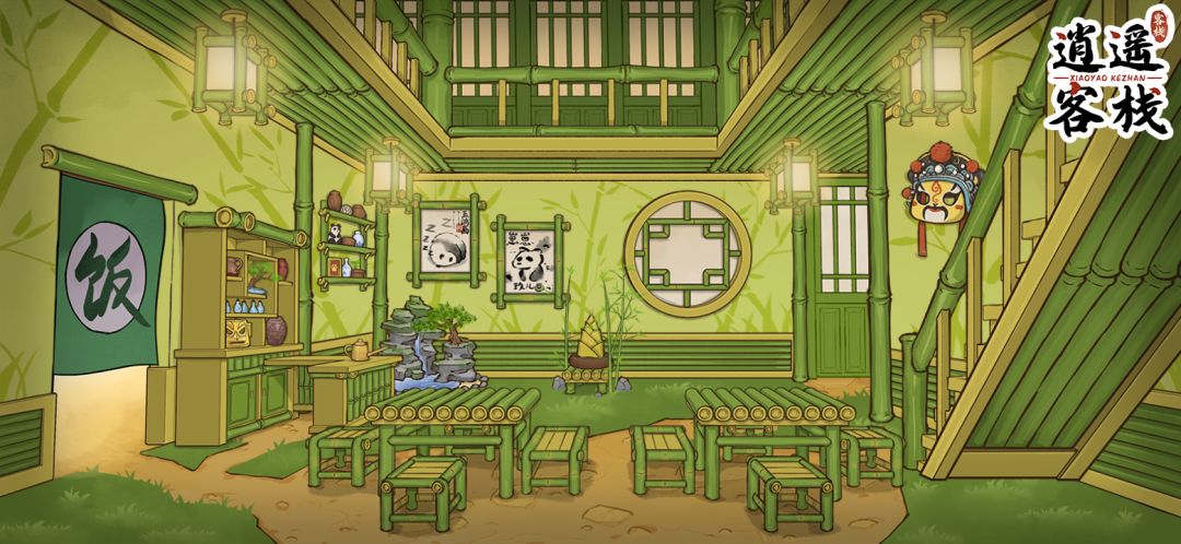 如果自然是一种颜色的话,那一定是竹的青绿!竹凳、竹桌、竹梯、竹灯笼...大量的竹子组合起来,竹林顿时出现在人们面前。竹香清远,只是坐在里面就感觉心旷神怡。烛光透过白色的灯笼纸,照的屋子里亮堂堂的。角落里摆放着小山流水,一颗青松在山间倔强的生长着。墙上的竹画框里有绝世名家的作品,柜子里摆放着酒和特殊的面具。进入客栈,仿佛置身于竹林之中一般,让人恍然间仿佛与自然合一。